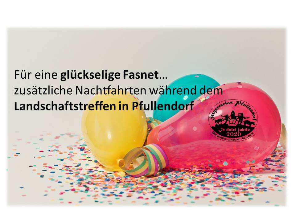 In Zusammenarbeit mit der Narrenzunft Pfullendorf und den Verkehrsunternehmen KVB und RAB wird den Gästen des Landschaftstreffens der VSAN eine unbeschwerten An- und Abreise mit dem Öffentlichen Nahverkehr ermöglicht.